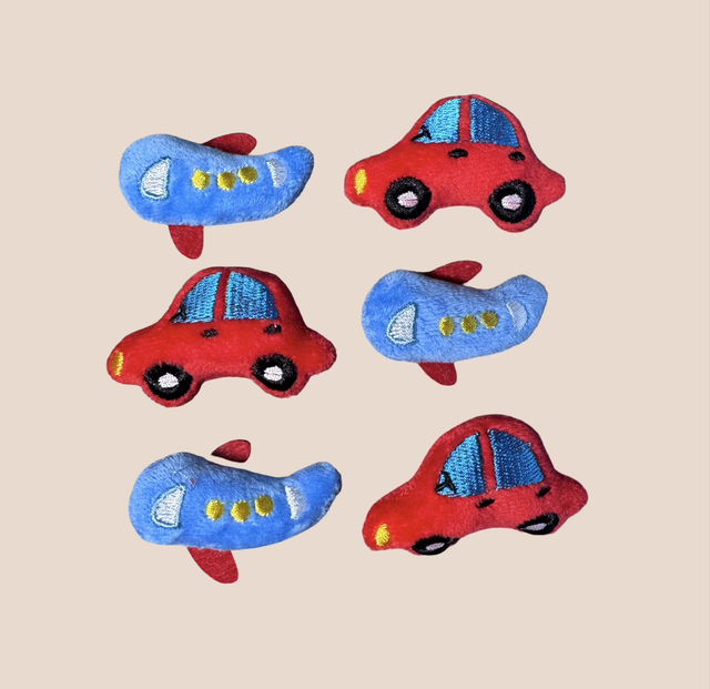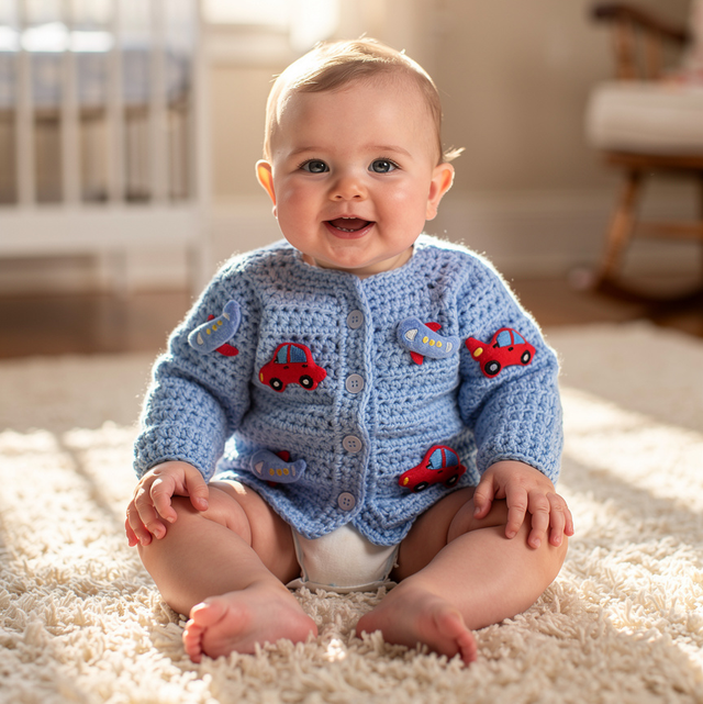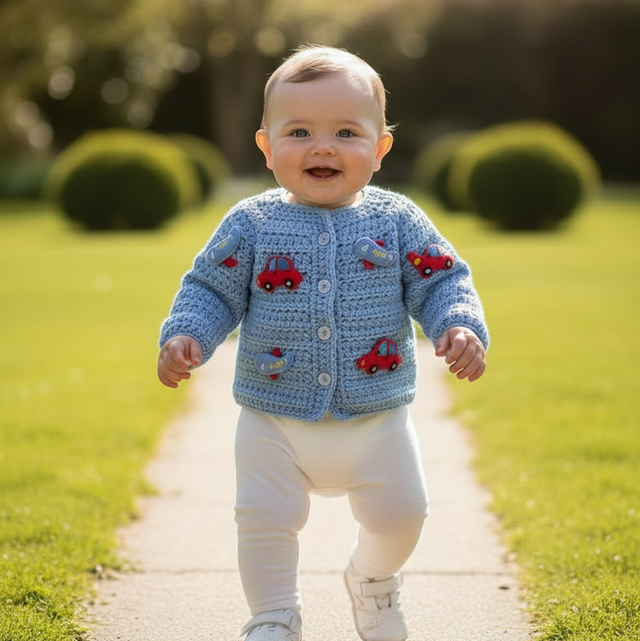 Blue Cardigan featuring sewn-on car and plane appliqués