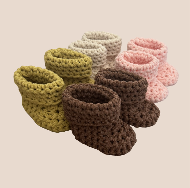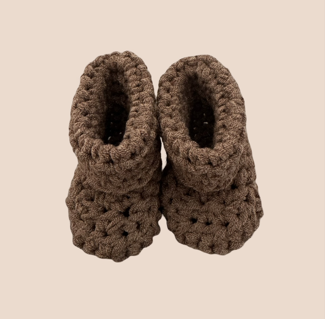 Keep tiny toes cozy in style with these soft, hand-crocheted baby booties. Made with love from plush, soft wool these booties are gentle on delicate skin while providing warmth and comfort. The neutral brown color makes them perfect for your little ones feet during the colder months.