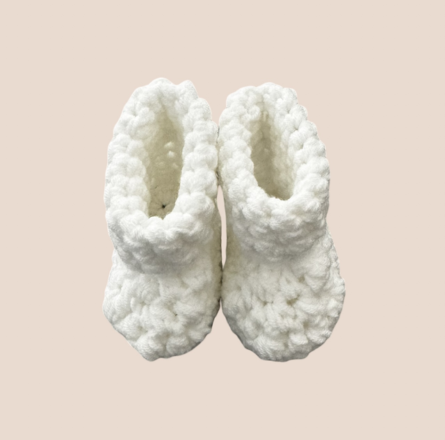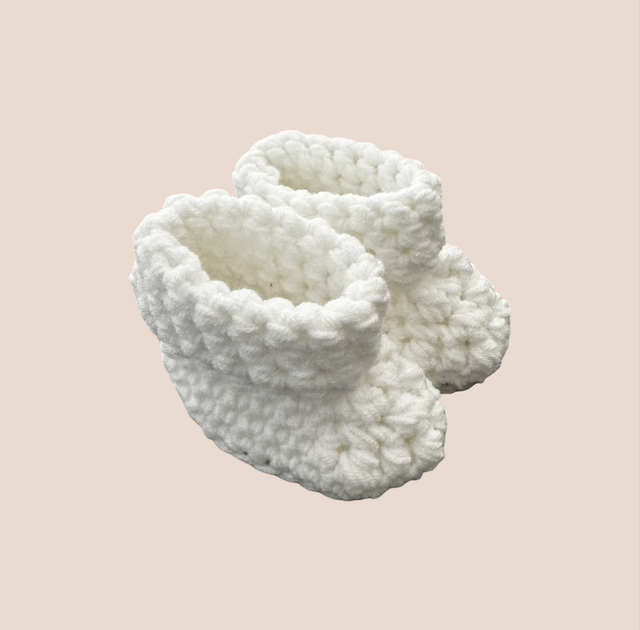 Keep tiny toes cozy in style with these soft, hand-crocheted baby booties. Made with love from plush, soft wool these booties are gentle on delicate skin while providing warmth and comfort. The lovely white colour makes them perfect for your little ones feet during the colder months.